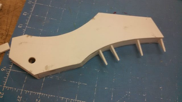 Started putting together the blade section from PVC foam. Made it from a flat piece then closed it off like a box. The scythe tip would slide into the blade section on the part mounted to the gun itself.